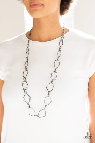 Varying in size, mismatched gunmetal frames connect across the chest for an edgy look. Features an adjustable clasp closure.