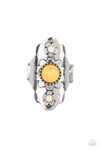 Featuring yellow and white stone centers, shiny silver flowers bloom atop a scalloped silver frame for a whimsically seasonal look atop the finger. Features a stretchy band for a flexible fit.