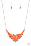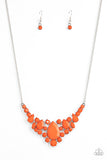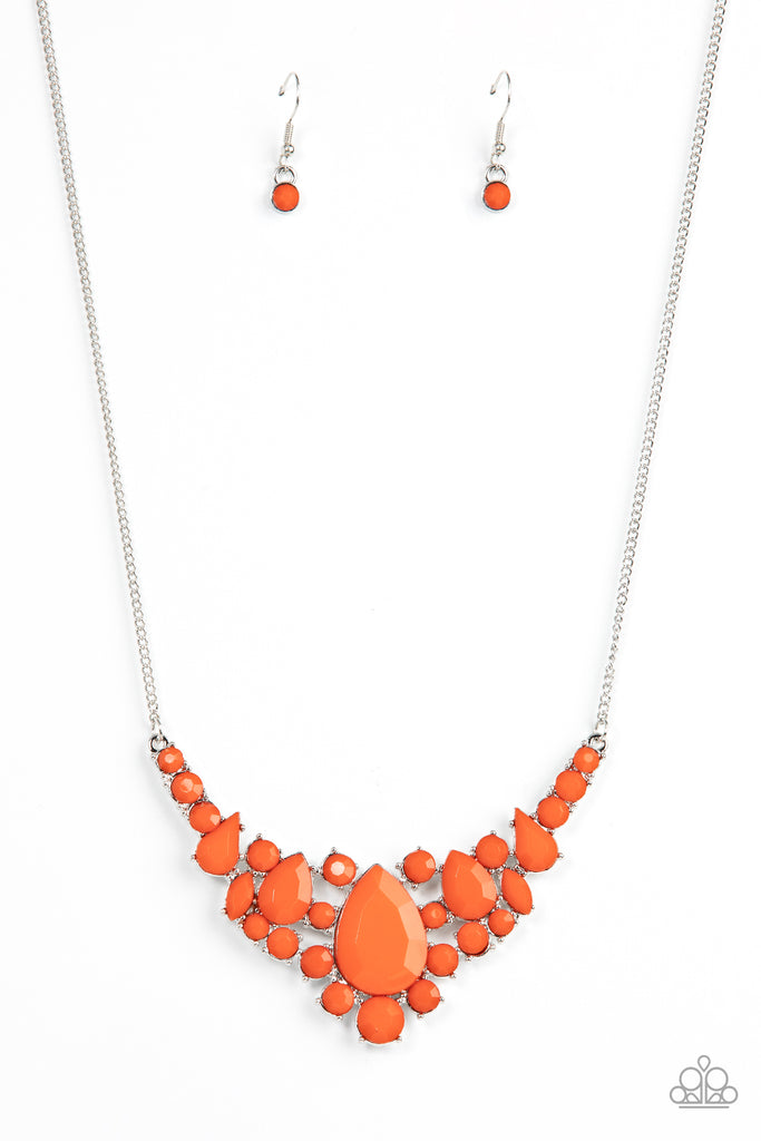 A faceted collection of round, teardrop, and marquise style orange beads coalesce around an oversized orange teardrop bead, resulting in a dramatic centerpiece below the collar. Features an adjustable clasp closure.