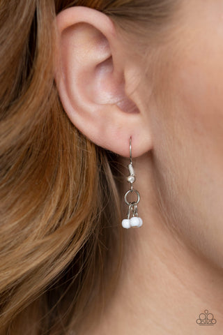 Embossed in tribal inspired patterns, silver half-moon frames link below the collar. Dainty white beads swing from the bottoms of the ornate frames, creating a flirtatious fringe. Features an adjustable clasp closure.