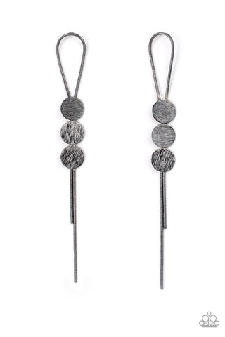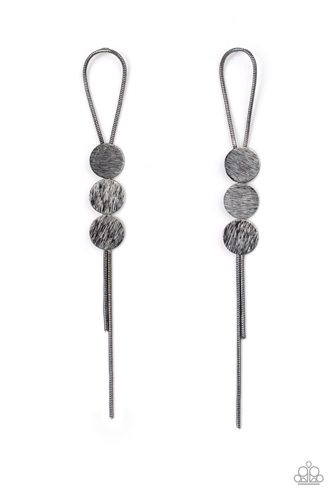 A gunmetal loop of round snake chain is held in place by a trio of scratched gunmetal discs, creating a trendy bolo-like lure. Earring attaches to a standard post fitting.