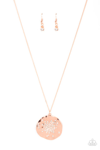 Dainty white rhinestones are haphazardly sprinkled across the front of an oversized and hammered shiny copper disc, resulting in an explosion of shimmer at the bottom of an extended shiny copper chain. Features an adjustable clasp closure.