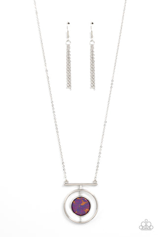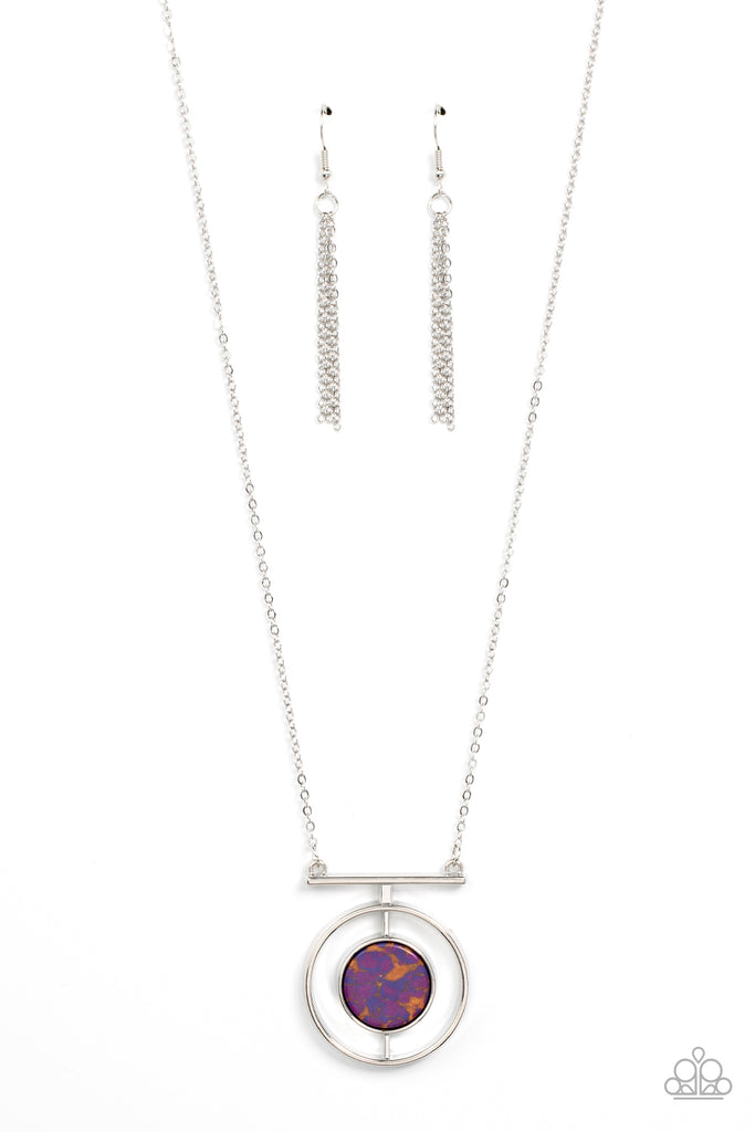 Encased in a sleek silver ring, a flat and speckled purple stone attaches to a silver rod inside of a flat silver ring, resulting in a modern stone pendant at the bottom of an extended silver chain. Features an adjustable clasp closure.