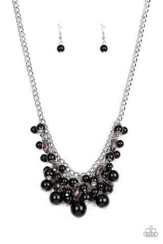 A bustling collection of black acrylic beads and smoky oblong crystal-like accents cascade from interlocked rows of shiny silver chain, creating a boisterous statement piece below the collar. Features an adjustable clasp closure.