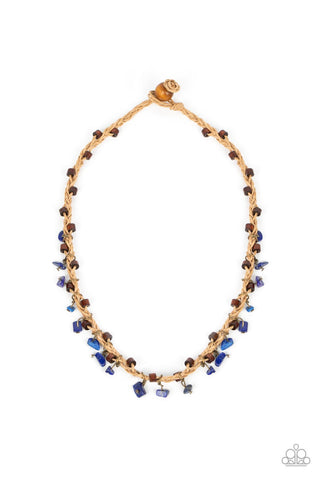 Infused with wooden accents, pieces of lapis lazuli swing from braided strands of crepe-like twine below the collar for a seasonal fringe. Features a button loop closure.