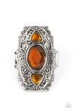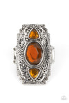 A mystical trio of oval and triangular cut brown beads stack across the front of a dramatically oversized silver frame abloom with studded and vine-like motif, resulting in an enchanting centerpiece atop the finger. Features a stretchy band for a flexible fit.