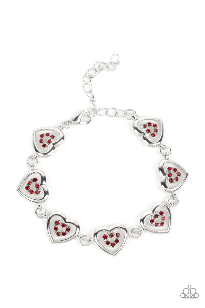 Dotted with dainty siam rhinestones, airy silver heart silhouettes are affixed to the points of larger silver heart frames. The two dimensional heart frames link together around the wrist in a flirtatious finish. Features an adjustable clasp closure.