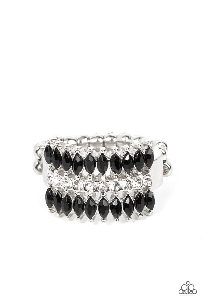 Two rows of marquise shaped black beads are separated by a single row of glassy white rhinestones, layering into a bold pop of sparkle around the finger. Features a stretchy band for a flexible fit.