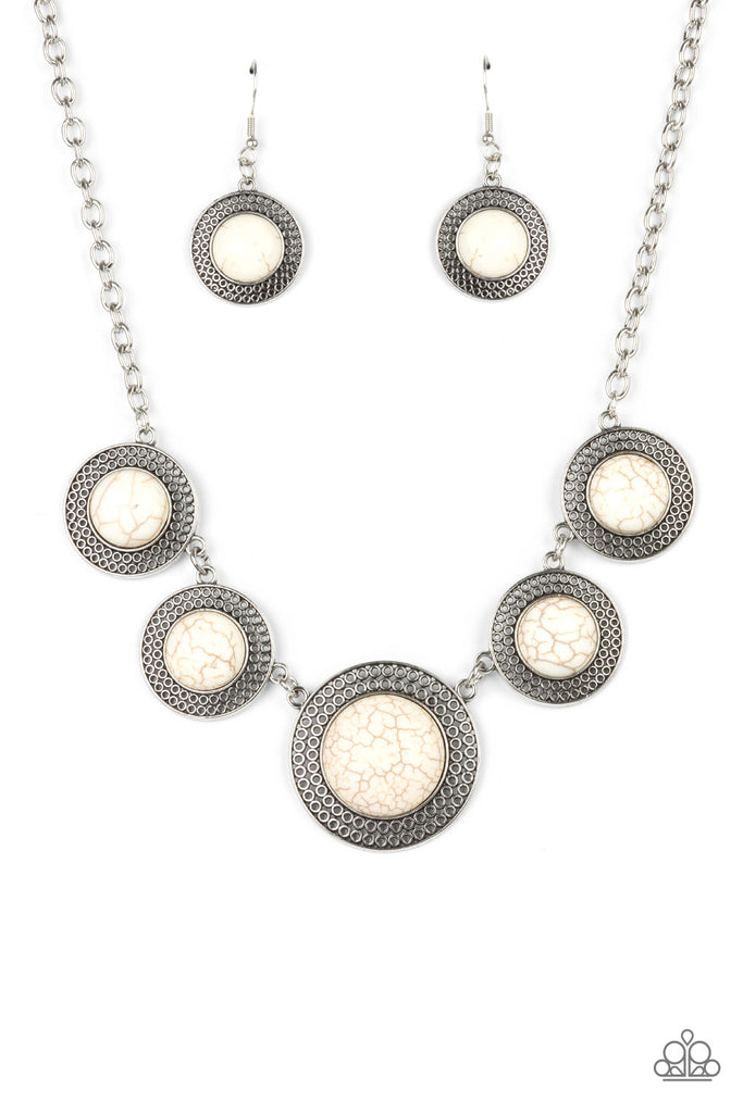 Earthy white stones, pressed into round silver frames made of concentric rows of open circles, create a dramatically rustic statement as they link across the collar. Features an adjustable clasp closure.