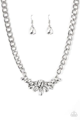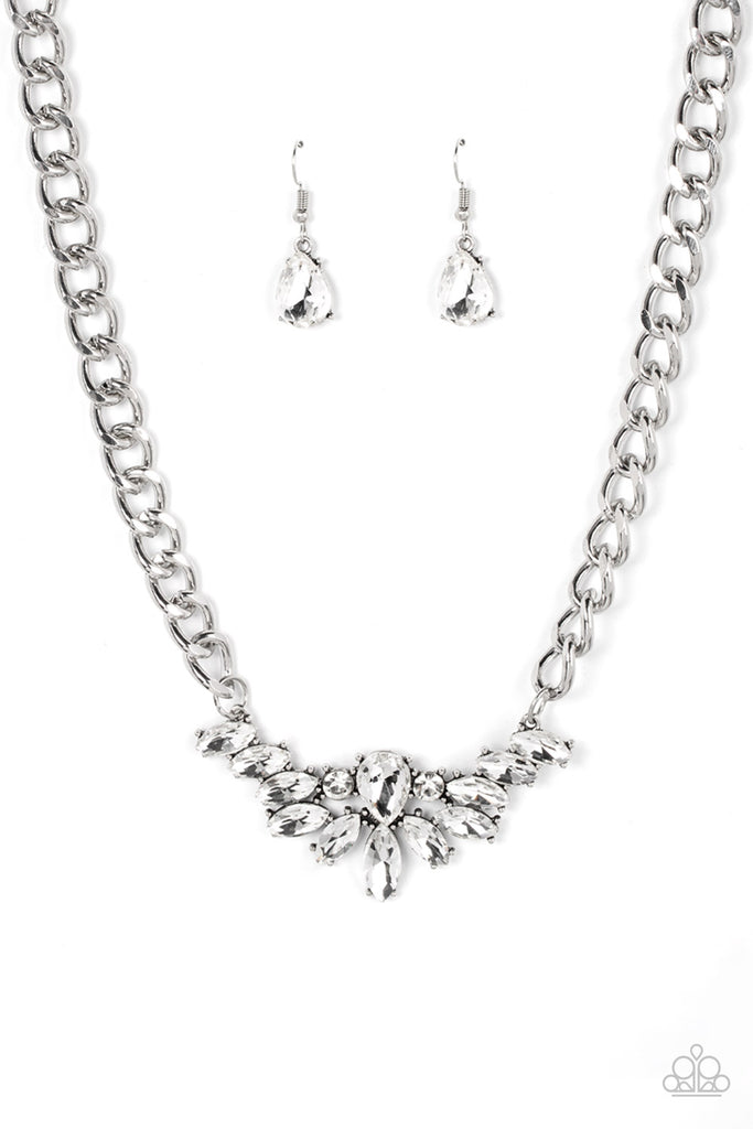 Glitzy marquise cut white rhinestones fan out from the bottom of an oversized teardrop white rhinestone, resulting in a gritty pendant at the bottom of a chunky silver chain for a sassy statement. Features an adjustable clasp closure.