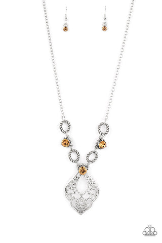 Twisted silver links and oversized golden topaz rhinestones delicately alternate below the collar. A hammered filigree filled silver pendant shimmers from the bottom of the centermost rhinestone, creating a contemporary pendant. Features an adjustable clasp closure.