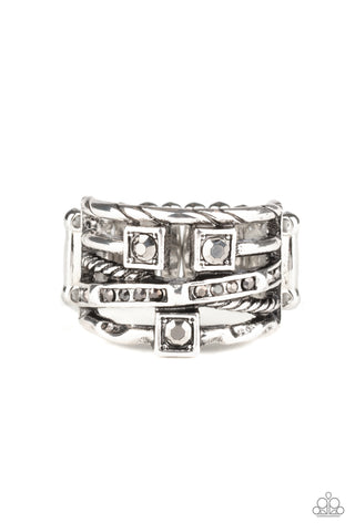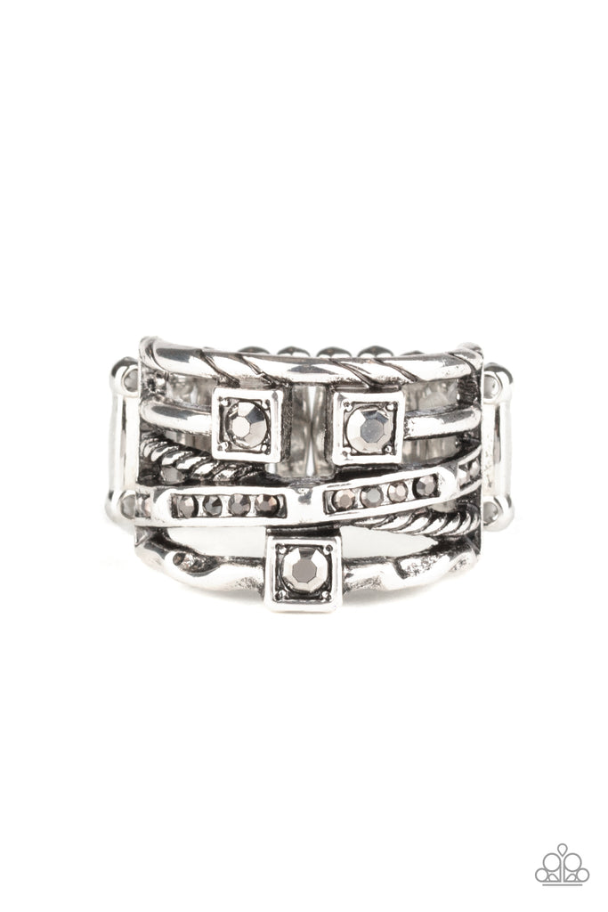 A collision of hematite rhinestone encrusted bands and antiqued silver bars arc and crisscross across the finger, layering into an edgy frame. Features a stretchy band for a flexible fit.