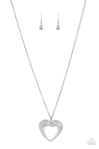 A flared silver heart is encrusted in glassy white rhinestones, resulting in a romantic shimmer at the bottom of an extended silver chain. Features an adjustable clasp closure.