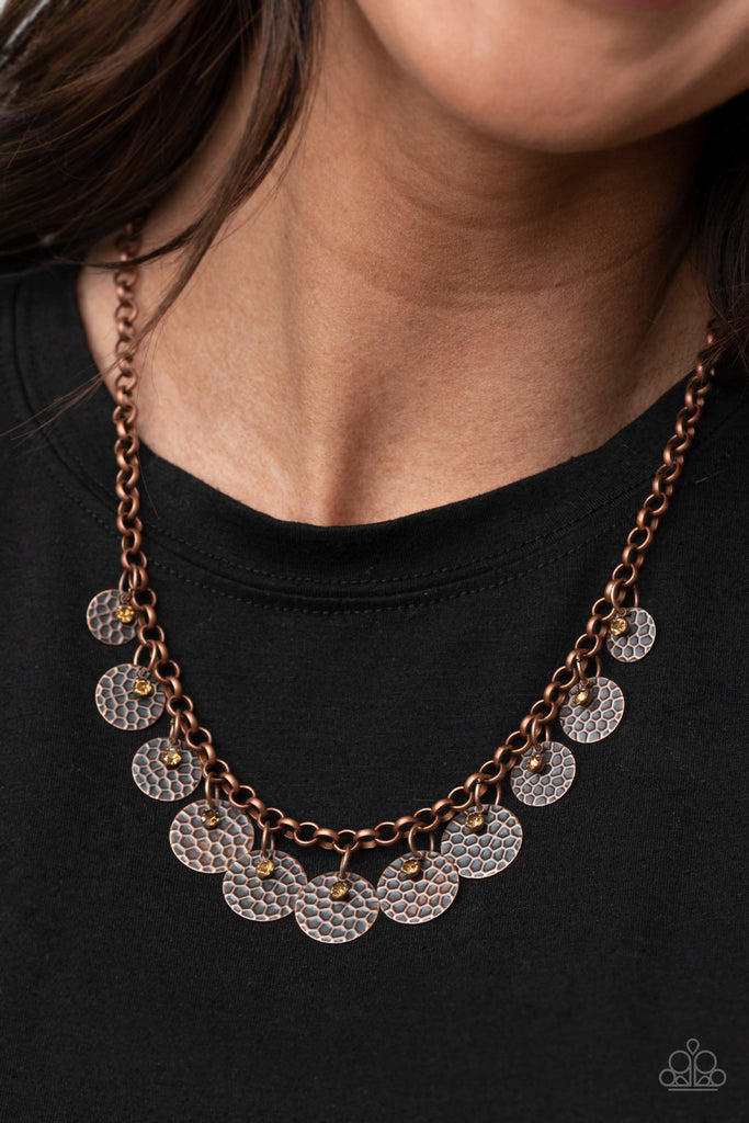 Antiqued copper discs hammered with a dappled design, dangle delightfully across the collar from a copper chain. Dainty smoked topaz rhinestones dance in front of each disc for a collision of flirtatious earthiness. Features an adjustable clasp closure.