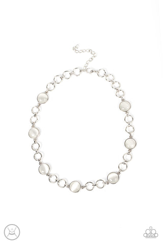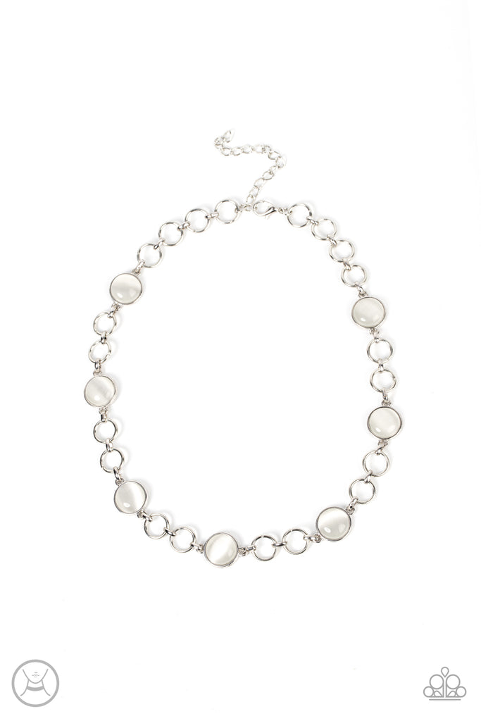 Pairs of silver hoops and white cat's eye dotted silver frames delicately link around the neck, creating a dreamy glow. Features an adjustable clasp closure.