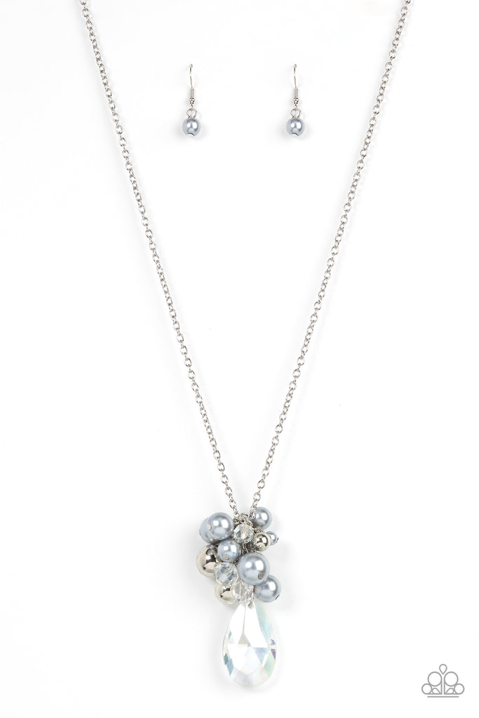 Featuring an iridescent shimmer, a dramatically oversized crystal-like teardrop swings from the bottom of a cluster of shiny silver, pearly silver, and crystal-like beads, creating a dazzling pendant at the bottom of a lengthened silver chain. Features an adjustable clasp closure.