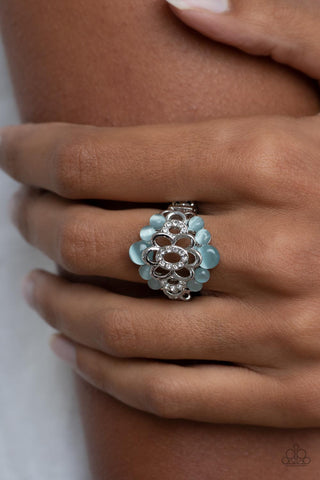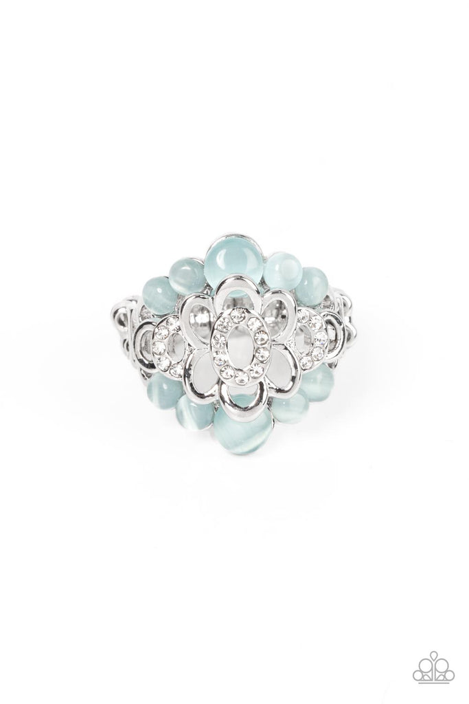 A white rhinestone dotted silver flower blooms atop bubbly blue cat's eye stone borders, coalescing into an effervescent sparkle atop the finger. Features a stretchy band for a flexible fit.