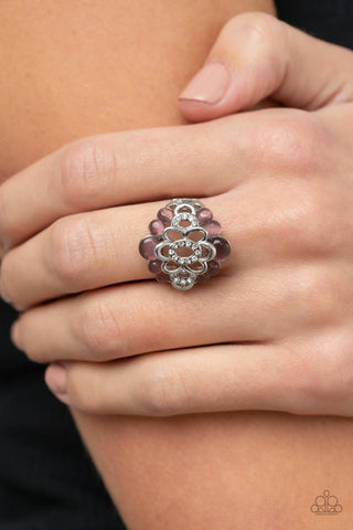 A white rhinestone dotted silver flower blooms atop bubbly purple cat's eye stone borders, coalescing into an effervescent sparkle atop the finger. Features a stretchy band for a flexible fit.