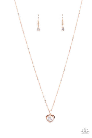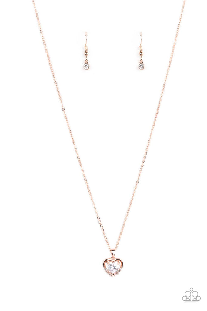 A brilliant white rhinestone, chiseled into the shape of a heart, is set in prongs of rose gold, where it emerges from a heart-shaped frame below. The elevated setting allows the solitaire gem to refract light in every direction, picking up the sparkle of the rhinestones that line the bottom edge of the frame that holds it. Features an adjustable clasp closure.