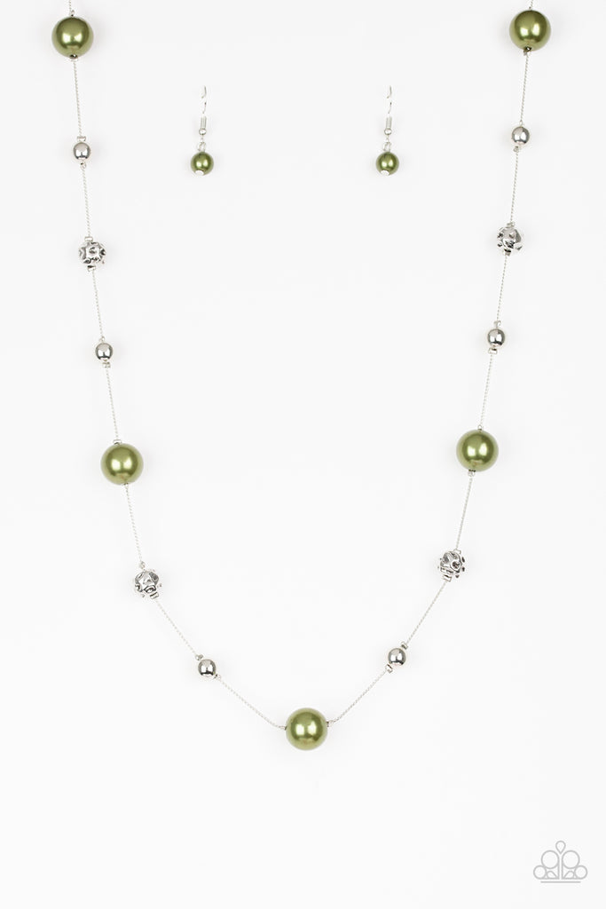 Infused with pearly green accents, classic silver and delicately hammered silver beads trickle along an elegantly elongated silver chain for a refined look. Features an adjustable clasp closure.