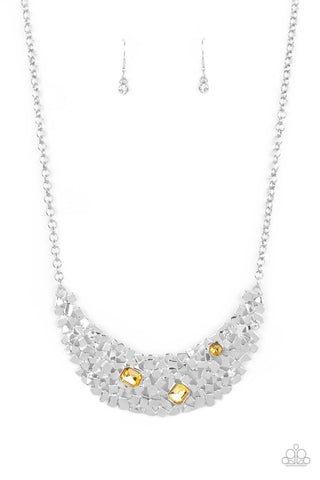 Sporadically dotted in mismatched yellow and white rhinestones, a smattering of fragmented silver frames coalesce into a bold half moon below the collar for an edgy fashion. Features an adjustable clasp closure.