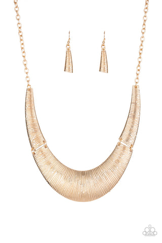 Etched in linear patterns, dramatic gold plates connect below the collar, joining into a fierce crescent-shaped pendant for a statement making look. Features an adjustable clasp closure.