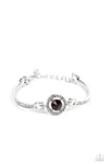 A brilliant purple rhinestone sparkles inside a circular frame of dainty white rhinestones. Curved silver bars adorned with a row of rhinestones connect on each side of the frame, wrapping around the wrist to complete the look. Features an adjustable clasp closure.