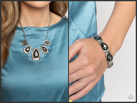 Delicately hammered in shimmer, a collection of shiny silver teardrops link below the collar for an edgy statement-making look. Set in each hammered frame, faceted, smoky teardrop gems add a dramatic pop of color to the design. Features an adjustable clasp closure.