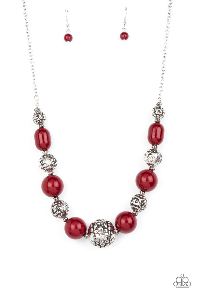 An oversized collection of wine colored beads and antiqued silver beads wrapped in a whimsical floral motif alternates along an invisible wire below the collar, resulting in a hearty pop of color. Features an adjustable clasp closure.