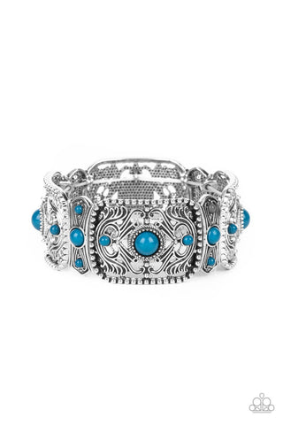 A bubbly collection of Mykonos Blue beads are sprinkled across mismatched silver frames whirling with vine-like filigree. The colorful frames are threaded along stretchy bands around the wrist, creating an enchanting pop of color.