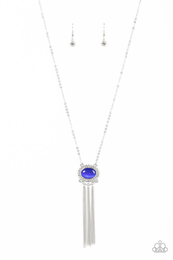 Attached to silver prongs, glassy white rhinestones radiate out from a Mykonos Blue cat's eye stone at the bottom of a dainty silver chain. A curtain of shimmery silver chains streams out from the bottom of the ethereal pendant, adding playful movement to the colorful display. Features an adjustable clasp closure.