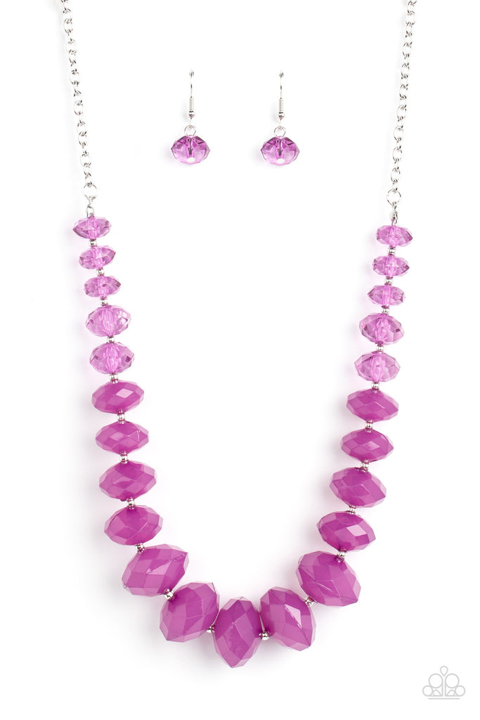 Separated by dainty silver beads, glassy Purple crystal-like beads gradually morph into opaque Purple crystal-like beads below the collar. The vibrant compilation grows in size and intensity further below the collar, adding dramatic dimension to the colorful centerpiece. Features an adjustable clasp closure.