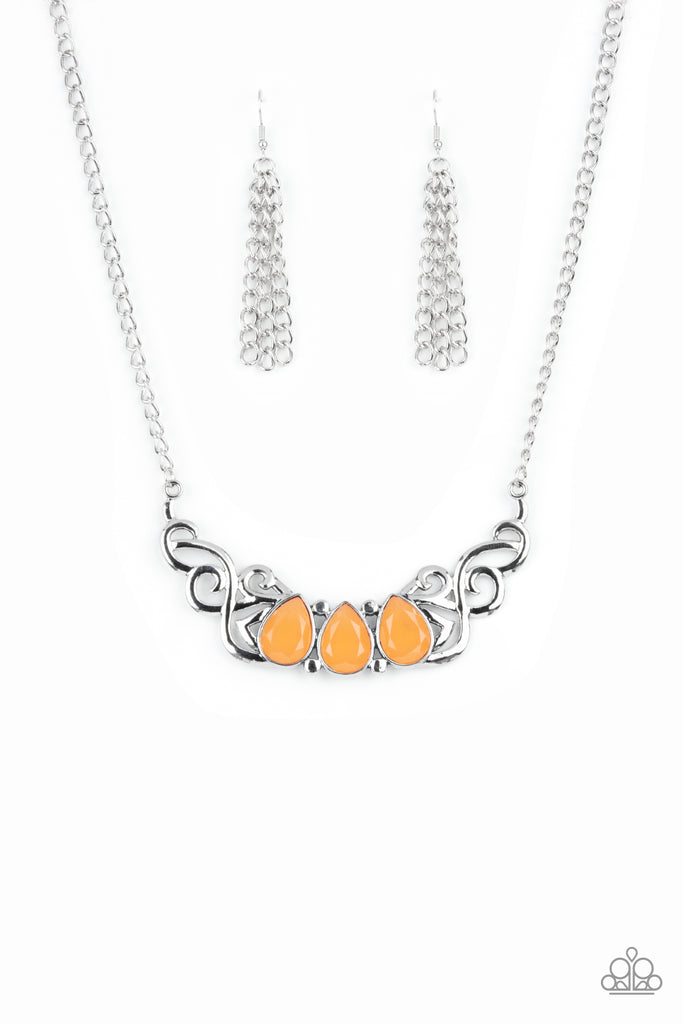 Featuring an opaque iridescence, a row of Marigold teardrop beads are pressed into a studded backdrop of vine-like silver filigree, creating a whimsical centerpiece below the collar. Features an adjustable clasp closure.