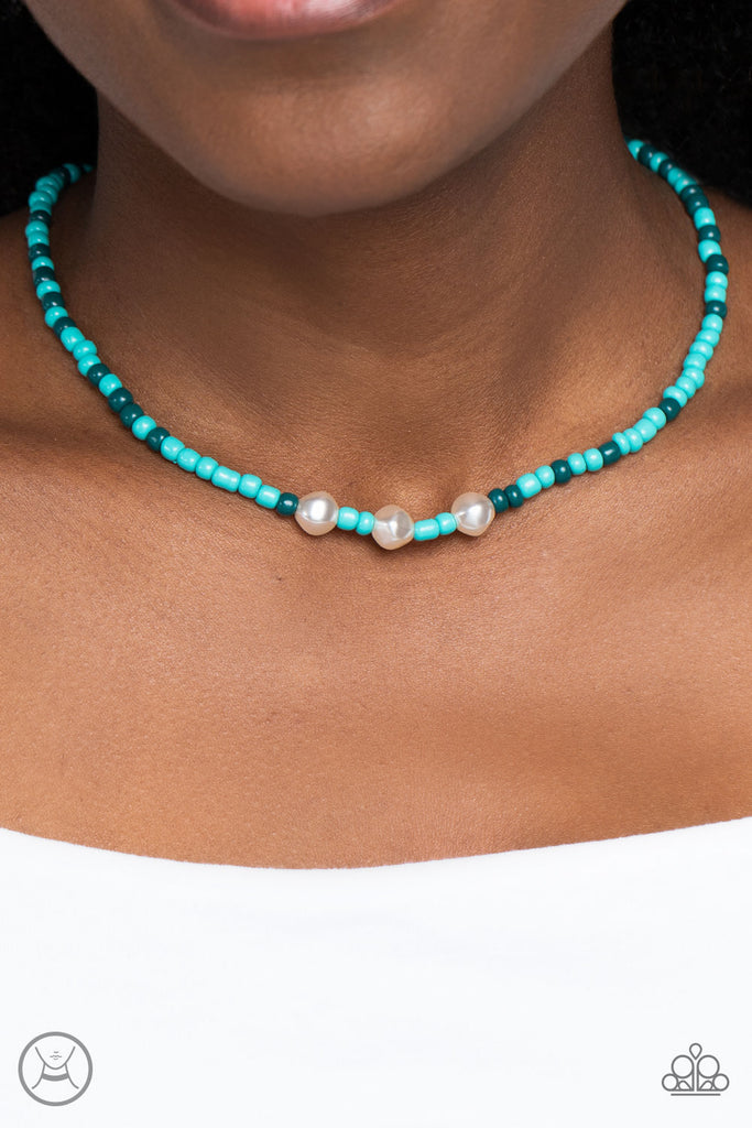 Stretched along an invisible wire, a collection of green seed beads in various shades, circles above the collar for a vibrant pop of color. Three baroque pearls interrupt the beading, adding a refined sheen to the design. Features an adjustable clasp closure.
