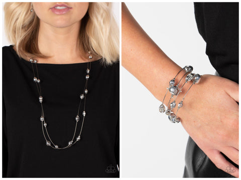 Glassy, clear beads sporadically dot two strands of skinny wire, creating the illusion of floating spheres falling down the chest. One side of each marble-like bead is dipped in a silver coating, adding a hint of metallic shimmer to the abstract design. Features an adjustable clasp closure.