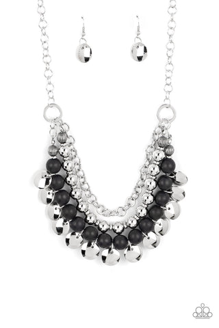 Reflective silver discs fall from between a strand of black stone beads, creating a collision of texture along the collar. A row of classic silver beads and a strand of silver chain layer above, draping between a pair of sleek silver hoops in a stunning finish. Features an adjustable clasp closure. As the stone elements in this piece are natural, some color variation is normal.
