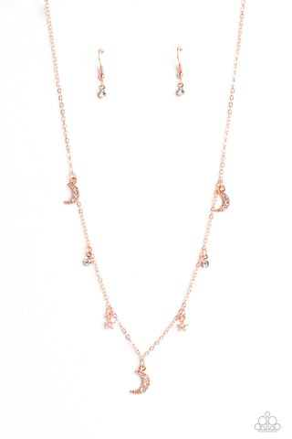 Dotted with dainty white rhinestones, a cosmic collection of shiny copper moon and star charms swings from a dainty shiny copper chain below the collar. Solitaire white rhinestones sparkle in between the charms, adding additional sparkle to the piece. Features an adjustable clasp closure.