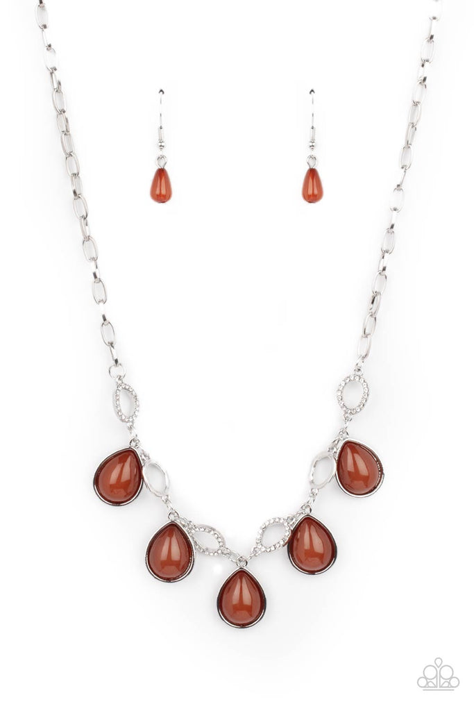 Encased in sleek silver frames, opaque brown teardrop beads link with dainty white rhinestone encrusted silver ovals below the collar, creating a mystical fringe. Features an adjustable clasp closure.