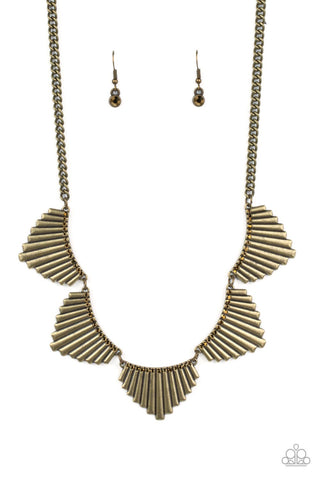 Crowned in glassy rows of sparkly topaz rhinestones, rectangular crimped brass frames fan out below the collar, creating a fierce metallic fringe. Features an adjustable clasp closure.