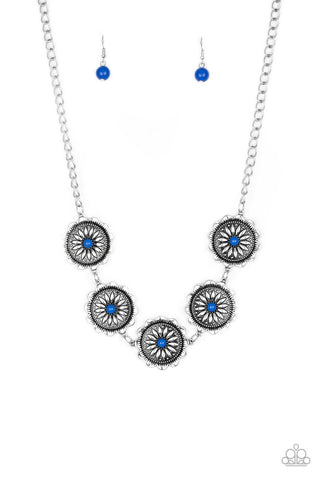 Infused with bright blue beaded centers, ornate floral stamped frames link below the collar for a colorfully, seasonal look. Features an adjustable clasp closure.