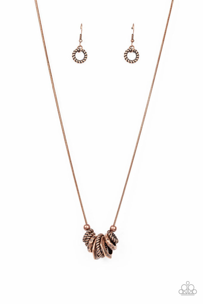 A gritty assortment of copper ropelike rings, hammered copper rings, and faceted copper rings glide along a rounded copper snake chain, creating an intense industrial collar below the collar. Features an adjustable clasp closure.