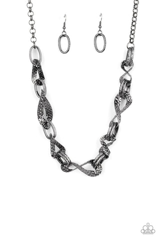 Hammered and embossed in geometric detail, pairs of gunmetal links connect with twisting gunmetal oval fames below the collar for an edgy, but refined look. Features an adjustable clasp closure.