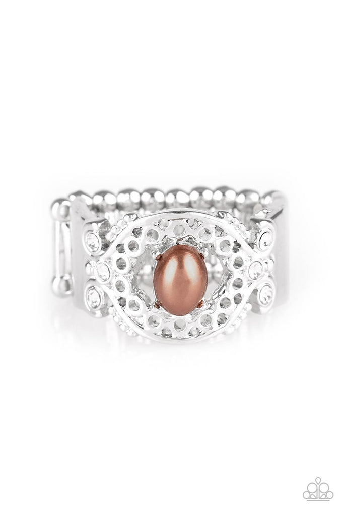 Dotted with glittery white rhinestones, an airy filigreed silver band arcs across the finger in a regal fashion. A pearly brown bead is pressed into the center of the band for a timeless finish. Features a stretchy band for a flexible fit.
