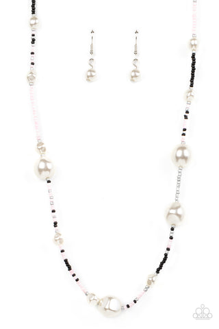 Irregular-shaped pearls in varying sizes are scattered amongst Gossamer Pink, black, and silvery seed beads that are threaded along a wire, resulting in a refreshing and playful style below the collar. Features an adjustable clasp closure.