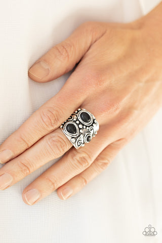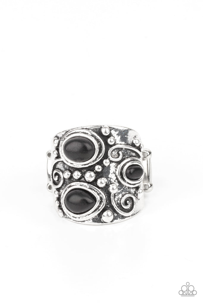 An earthy collection of teardrop and oval black stones are pressed into the front of a thick silver frame studded and embossed in tribal inspired patterns. Features a stretchy band for a flexible fit.