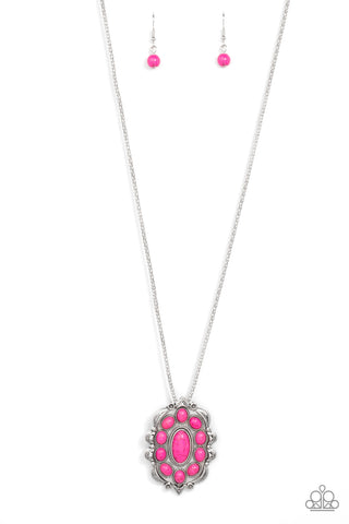 Vivacious pink oval stones embellish the front of a decoratively scalloped silver frame, creating an earthy floral pendant at the bottom of an extended silver popcorn chain. Features an adjustable clasp closure.