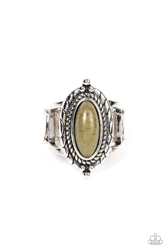 An oblong Olive Branch stone adorns the center of a ring of spun rope-like silver inside of a textured and studded silver frame, creating a colorful artisanal centerpiece atop the finger. Features a stretchy band for a flexible fit.
