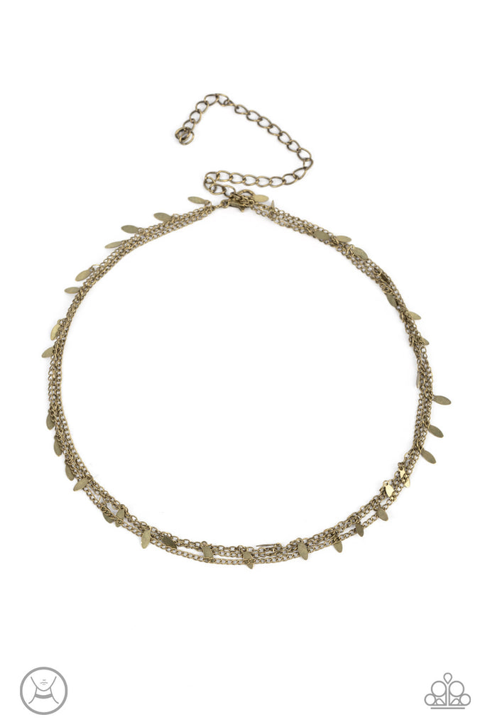 Infused with two dainty rows of antiqued brass chains, a row of brass oval discs glisten around the neck for a playfully rustic look. Features an adjustable clasp closure.