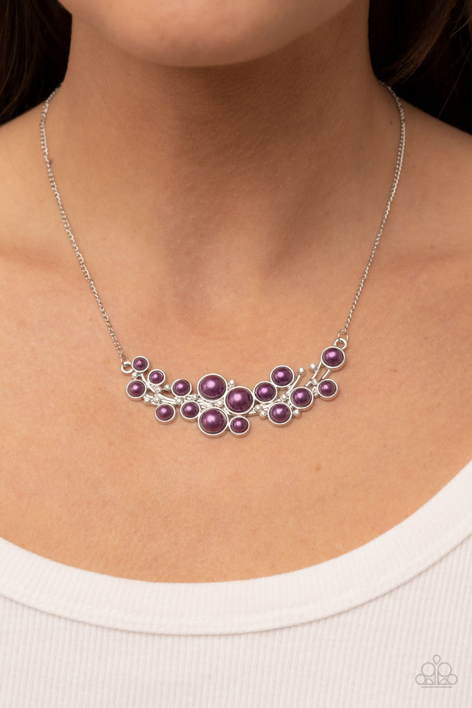 A bubbly explosion of purple pearls and glassy white rhinestones delicately coalesces into an effervescent collared pendant between two dainty silver chains. Features an adjustable clasp closure.