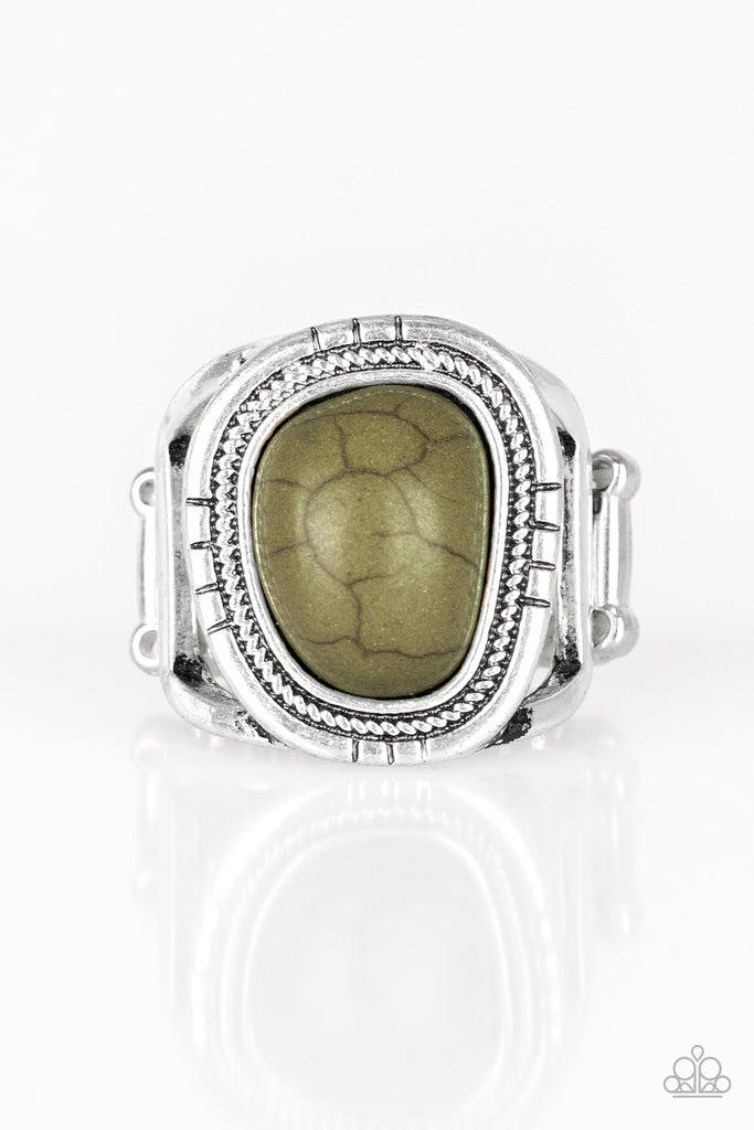 An earthy Military Olive stone is pressed into an asymmetrical silver frame radiating with tactile textures for a seasonal look. Features a stretchy band for a flexible fit.